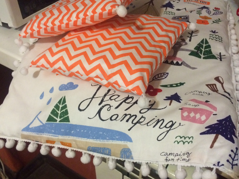 Потом воспитатели попросили ещё скатерть и получилось такое чудо с помпошками. Я эти помпошки просто обожаю. С ними любая вещь становится такой уютной