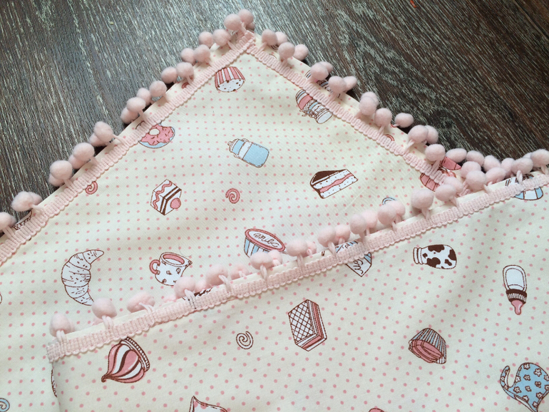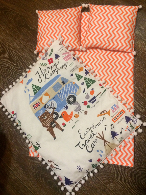 Потом мы с мужем заказывали столик и кроватку в группу и захотелось сшить ещё в эту кроватку постельное. Одеялко разное с двух сторон и опять, полюбившиеся мне, помпошки)))