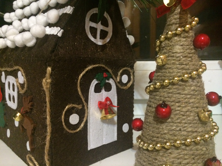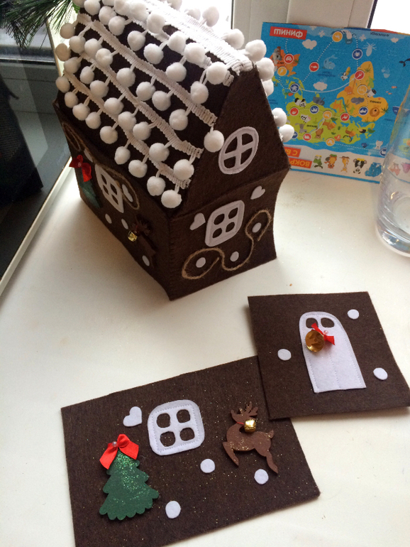 Так как скоро скоро Новый год начну с наших новогодних поделок. С Самирой мы делали пряничный домик из фетра, о котором я мечтала уже очень давно. И вот решились. Внутри картонная коробка с картонной крышей. Самиру привлекала как могла, Лейла тоже помогала.