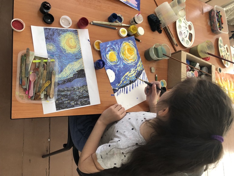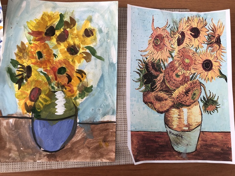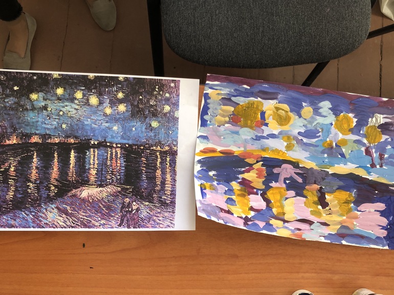Творчество детейПомню слышала как то раз обывательские разговоры о том, что включать классическую музыку малышу и надеяться на развитие его музыкального слуха и вкуса - это сплошной вздор. Однако, проверив на своих детях заявляю, что никакой это не вздор! Мало того, что дети очень любят сейчас многие известные композиции, так и предпочтут скорее классику или акустику послушать, чем незатейливую попсу из каждого утюга. А я то человек в музыкальном плане разносторонний и мне по настроению разное заходит, но дети услышав попсу тут же затыкают уши и просят включить что то академичное. Правда как то раз Лили пришла из школы и такая: мам, можно я тебе спою и станцую? Я приготовилась слушать типо: От улыбки хмурый день светлей... А она мне такая опа! Танец в стиле Vog и напевает: «Я кошечка гламурная! Мур-мур-мур-мурная !» Я на минуточку присела и переварила молча, потом спросила: тебе нравится эта песня? А она: « да, мам, она крутая!» « Ну ок, тогда, дочь!» Все мы перебирали кучу всего и искали себя когда то, и им тоже надо дать шанс себя попробовать и поискать, чтобы понять, что же на самом деле бриллиант! «Только папе, доча, лучше эти песни не пой, не зачем его раньше времени поражать своим талантом!» « Ок, mum!" Ну так вот, я однозначно уверена в том, что ребёнку просто необходимо дать сначала что то действительно бесценное, вечное, монументальное, по хорошему такое качественное, потому что потом много он перепробует в своей жизни, но невольно сможет почувствовать фальшивое и бездарное, а к действительно прекрасному его будет тянуть. И кроме того, вы замечали как мало людей, кт по настоящему умеют слушать? Да что там слушать музыку, хотя бы собеседника. А классическая музыка и этому учит: слушать и слышать. И я обещала выкладывать разные работы детей и наши занятия. Сегодня рисовали с картин Ван Гога. Кстати, отличный способ учится рисовать и одновременно изучать историю искусства.