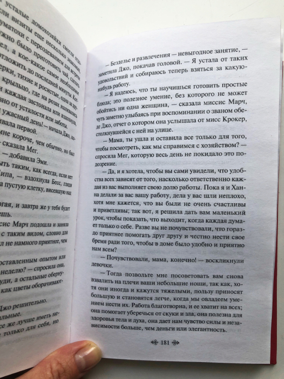 «Маленькие женщины»- в 1868 году вышла самая известная и популярная книга Олкотт. Этакое классическое произведение 19 века о формировании, взрослении и самопознании четверых юных барышень, четверых родных сестёр. Впоследствии автор напишет условное продолжение истории этих героев в книге «Хорошие жены», затем выпустит книгу «Маленькие мужчины» и их продолжение в книге «Маленькие мужчины становятся взрослыми». Но именно книга « Маленькие женщины» станет очень популярной и станет классикой на все времена и для разных поколений. Могу догадываться почему, потому что история о 4- х разных сёстрах, а ведь именно женщины обожают зачитываться подобными историями. А ещё эта книга, просто настольная книга по воспитанию маленьких леди. Она о том, о чем так часто забывают поговорить мамы со своими дочерьми. О том как важно уважать себя, не размениваться на меньшее, как важно трудиться, но и не забывать отдыхать, заботиться не только о своей внешности, но и о своей душе и благоразумии. Миссис Марч, мать девочек - воплощение идеальной, вдумчивой, доброй, заботливой, участливой и мудрой матери. Она даёт им такие простые и одновременно мудрые советы, о том как вести себя с противоположным полом, какого круга общения стоит избегать, как быть хорошей хозяйкой и женой, как важно учиться, иметь любимое дело и не разменивать себя на мимолетное. Эту книгу обязательно должна прочитать каждая мама девочек и своим девочкам я подсуну ее для самостоятельного чтения ещё чуть позже, когда они подрастут и многое им откроется с другой стороны. Конечно, сейчас она была для них в чем то непонятной, но уже очень полезной. Не проходите мимо этой книги, она должна быть у каждой девочки.