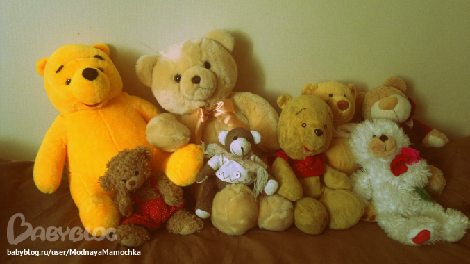 Вот маленькая медвежья шайка тихонечко "тусуется" на детской кровати, это не все, остальные аккуратно припрятаны мной на время, иногда я меняю их, а то совсем заполонили дом. Такое ощущение, что старшая коллекционирует их, каких у нас их только нет уже! Она найдет их везде и попробуй откажи в покупке еще одного: "Мимимимимишеньки!" Всех их старшая обожает, целует постоянно, и рассказывает какие они хорошие и добрые и их нельзя обижать, а надо любить!