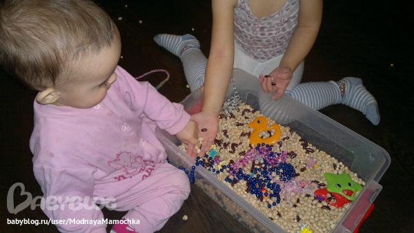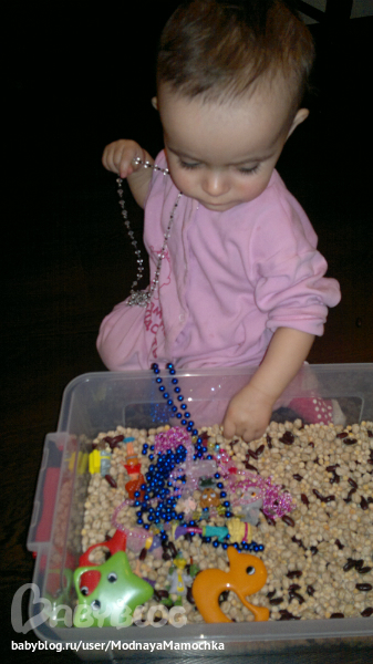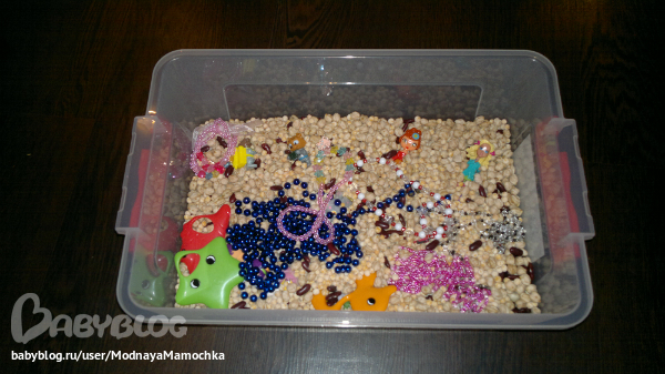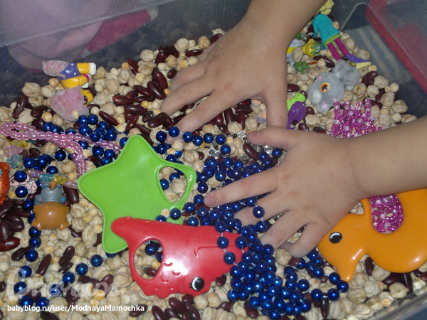 Всяких сенсорных игр и штучек полно. Мы любим такие сенсорные коробочки, поначалу просто были с крупами, бобовыми и т. д. Но намного интереснее детям показались тематические, когда там много всякого разного на определенную тему, одна из любимых такая вот "Девчачья сенсорная коробочка", которая состоит из красной фасоли, нута, обычного гороха, разных бус, браслетиков, четок, маленьких куколок, котят и пони