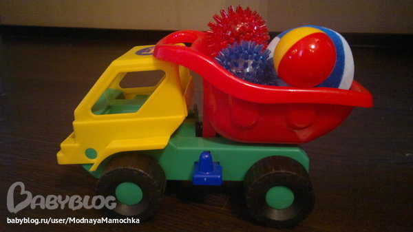Берем любой не маленький грузовик, в кузов загружаем разные небольшие мячики и шарики. Грузовик едет и вдруг переворачивается! И нужно попросить малыша помочь собрать шарики, заодно рассматриваем их и катаем по себе.