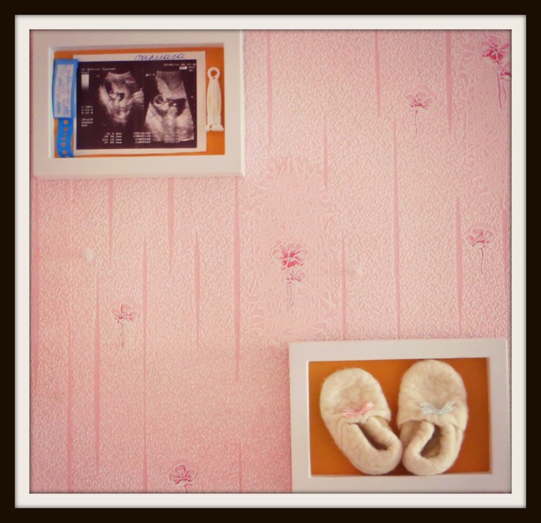 В другуя рамку я поместила снимок с узи, прищепку для пупочка и бирочку с роддома: