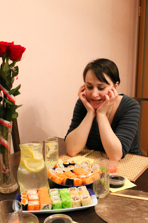 Красивые и счастливые! Цветы просто прелесть- молодец подруга). Роллы подразнили )))!