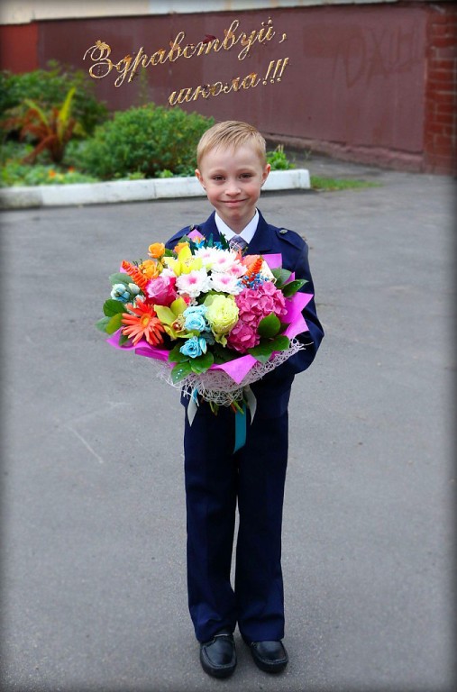 В общем, времени на сборы не было совсем. В психах я вытолкнула мужа с Матвеем из дома, а сама помыла голову (ибо с ЭТИМ выходить на улицу противопоказано) и пулей с Лукой вылетела из дома вслед... Говорить о каком-то там завтраке не пришлось... Слава Богу что на линейку не опоздали, хотя, конечно, второй класс - это уже не первый... И букетик вдвое меньше и проще, да и в глазах (о Боги) уже не тот пушистый наивный испуганный мальчик...