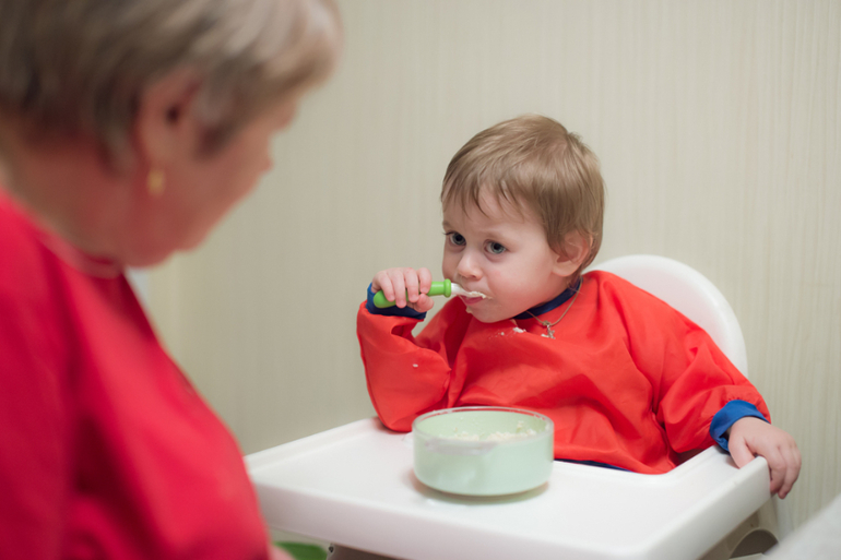 Ну и напоследок, на тему кухни. На днях приезжала бабуля и предприняла новую попытку научить Луку самого кушать ложкой.