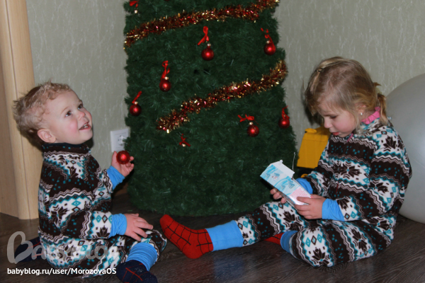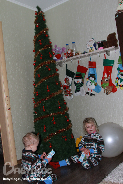 прибежали...незаметно из шкафа достала сладкие сюрпризы, передала за спиной деду)) он еле-еле успел скинуть из под елочку)))))))))))))) Дети чуть было не опередили его "на повороте" )))))))