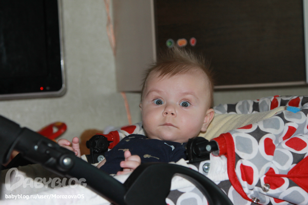 проснувшийся с нашим приходом Филиппок с удивлением наблюдал за происходящим из коляски)))))))))) вытянув шею)))))))))))))) Мой маленький сладкий Зайчонок!!!!!!!!!! через год он так же будет с интересом и жадностью распаковывать свой , можно сказать, перый подарок!)))))