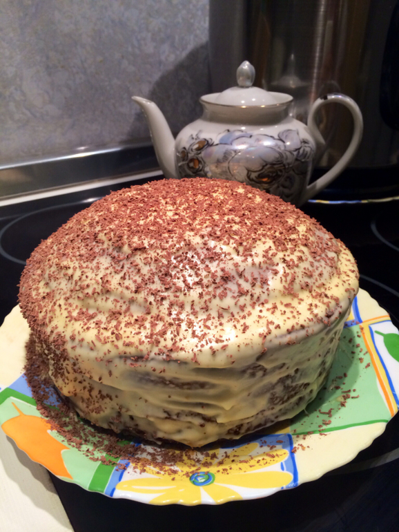 Сегодня на супер скорую руку замесила, спекла, нарезала на коржи и, пока они остывали на лоджии, смешала крем ( сгущ/масло) и, собственно, смазала и слепила тортик))