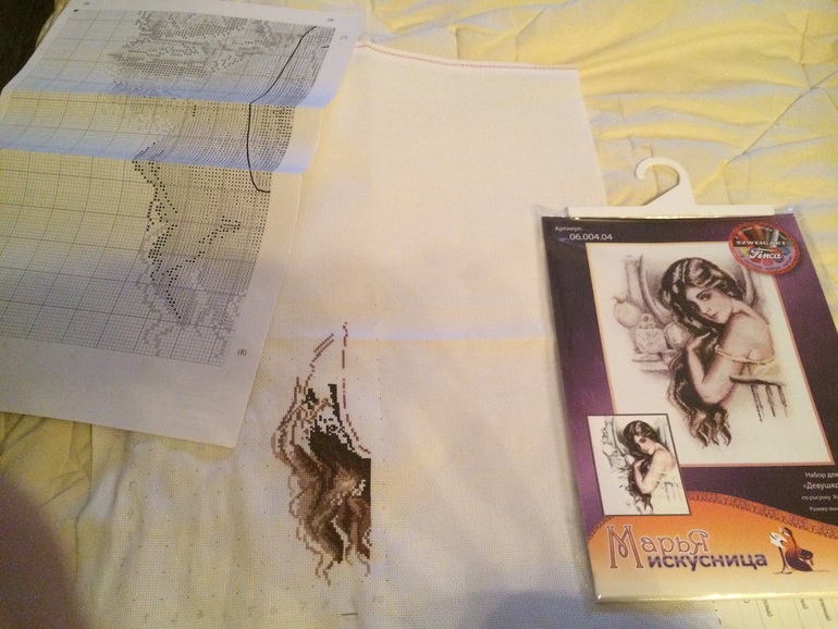 А я накануне распечатала из инета схемку этой картинки) и вы не поверите, но именинница - одно лицо с этой девочкой! И прическа, и цвет волос....Так что над подарком для Лизы долго не пришлось голову ломать) и за 4 дня с подбором ниточек "на глаз" , от всей души и с любовью , вышилась эта картина на память доброй девочке)