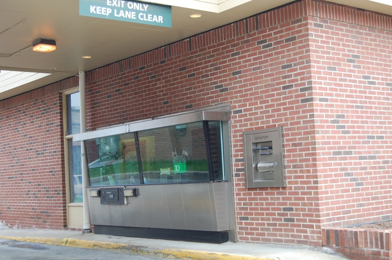 Банк, не выходя из машины. У нас я такого разврата не видела, только подобные банкоматы. А тут сидит человек и можно сделать все, что нужно, за рулем.
