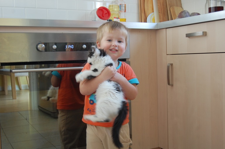 Котиков привозили из фостерных семей их временные хозяева. Двое черно-белых котят прибыли первыми, дети сразу же заныли: берем и едем.