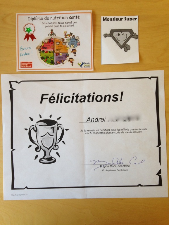 школаАИ постоянно таскает из школы всевозможные "грамоты" и "дипломы". Хорошо себя ведешь - вот тебе сертификат от директора. Раздавали детям яблоки в рамках осенней темы - поздравляем, что ты питаешься правильно. Помогал убирать игрушки в классе - вот тебе снова карточка.