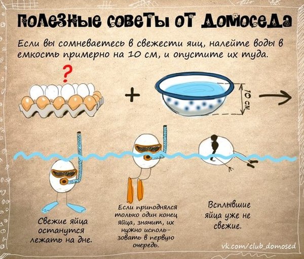 Положите яйцо в стакан с холодной водой. Если оно потонет и примет горизонтальное положение, оно очень свежее; если оно оказалось немного под наклоном, ему примерно неделя; если яйцо стоит вертикально на днее - больше недели. Если ПЛАВАЕТ вертикально, оно не свежее!