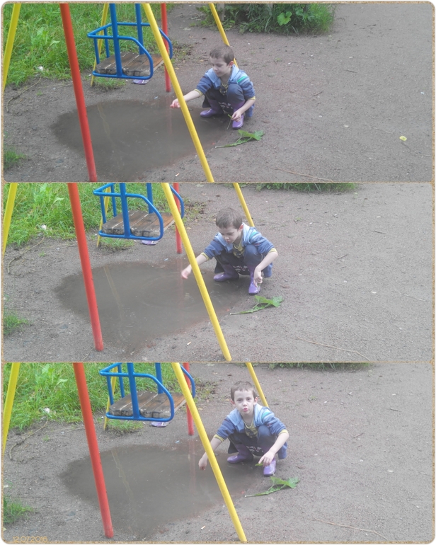 Дождавшись, когда солнце победит дождь, отправились по магазинам. Деник по пути не пропустил ни одной, даже самой маленькой, лужи. В одной, наиболее колоритной - грязной, мутной, илистой - прилип подошвами сапог ко дну. Пока ждали маму из овощного, валандался в луже посреди тропинки, окунал в неё листья подорожника, что-то негромко приговаривая.