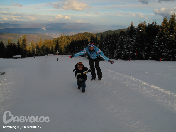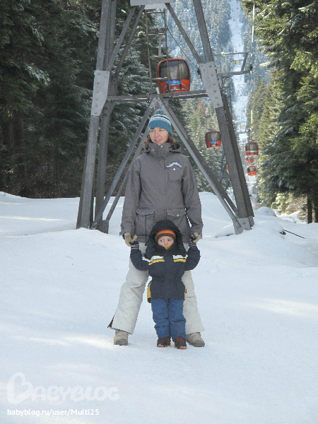 В целом для самых маленьких деток развлечений минимально - мы катались на лошадках и на снегокате. У нас в доме снегокат мы брали за 5 лев в день (это 100 руб), один раз не взяли, а в центре деревушки с меня попросили 20 )))))) Конечно на всех подъемниках прокатились, горы посмотрели. Креселки назывались у нас качелями, и все время просился кататься на качелях )))))) Первое время на каждого лыжника пальцем показывал - потом привык )))))) Ну и конечно ратраки - он мог час стоить и смотреть как они вечером ровняют трассы! да и вообще - всякого рода конструкции приводят его в полный восторг! Катя с Сережей на лыжах, а мы с Илюхой провожали их и потом стояли и смотрели, как кабинки гондольного подъемника приезжают, уезжают ))))