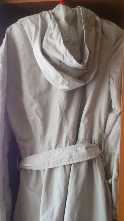 С капюшоном, по низу идет кулиска, пояс, рукава интересно скроены, глубокие карманы. Очень легкий. Цвет слоновой кости