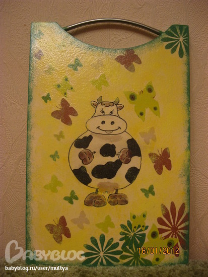 Ход работы: Ошкурила досочку, загрунтовала, покрасила доску в персиковый цвет (смешала белую, желтую и красную краски), нанесла один слой лака, приклеила салфетку, нанесла 3 слоя лака, смешала белую и желтую краски и методом тампонирования окрасила фон, сделала окантовку по краям, 3 слоя лака, пошлифовала шкуркой, 1 слой лака.