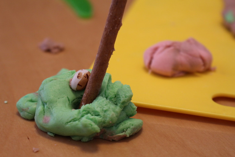 Саша любитель повозиться с тестом. Делаем из него мороженное- шоколадное,клубничное, фисташковое и т.д, пироженки, любим украшать и делать отпечатки на тесте ракушками, специями или морскими звёздами.Раскатываем овальный блин и выкладываем на нём смешные рожицы. О том что остаются отпечатки Саша углядел сам, потыкав звёздочкой бадьяна по тесту. Очень красиво и по весеннему получилось. Я так теперь и подаю шарики " в цветочек". Окрашиваю пищевыми красителями в сочетающиеся между собой цвета, дети обязательно перемешивают тесто, но вида оно не теряет.Сергей использует тесто как стройматериал. Сразу пригоняет машинную технику. Но иногда может наделать приличной лапши или придумать как из этого шарика сделать "БУБлик" при помощи втулки от пищевой плёнки.