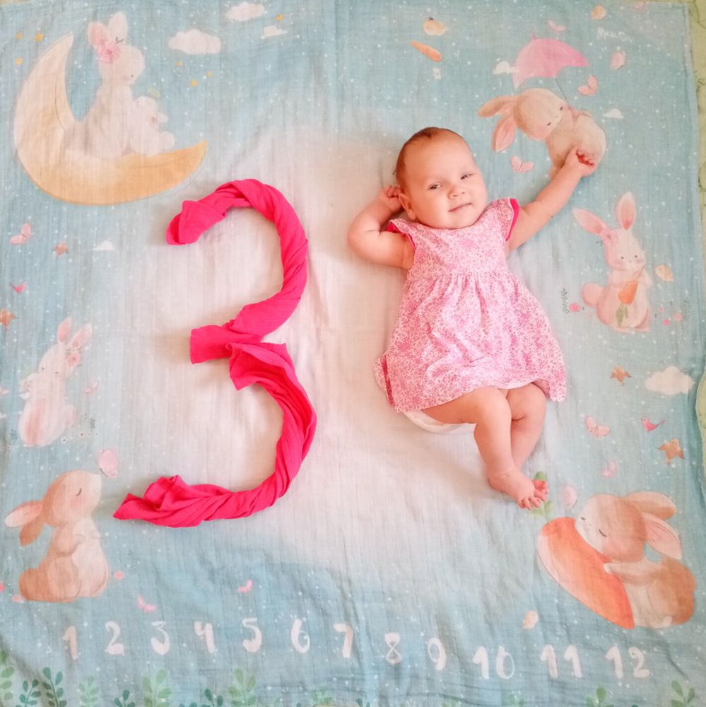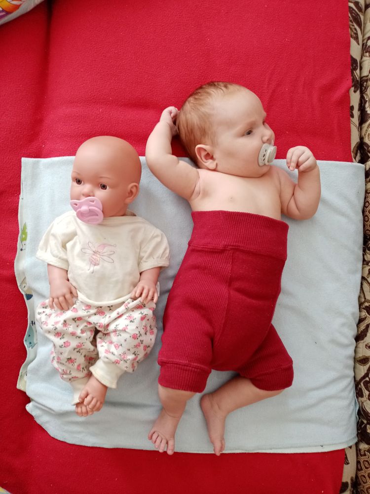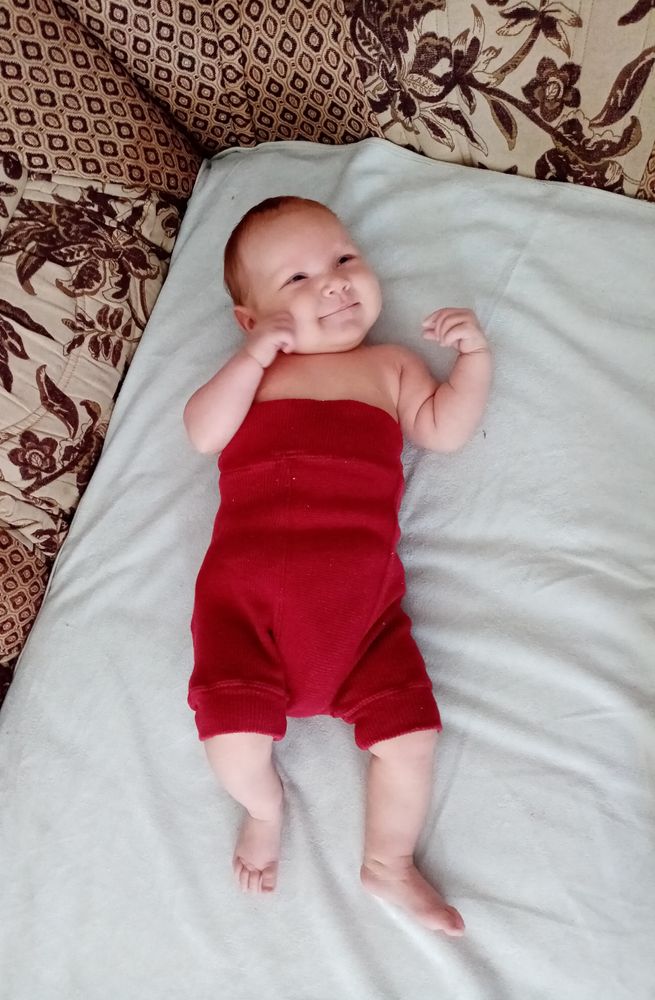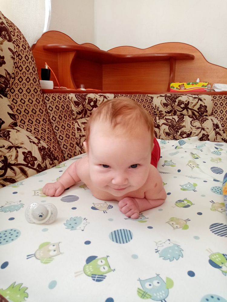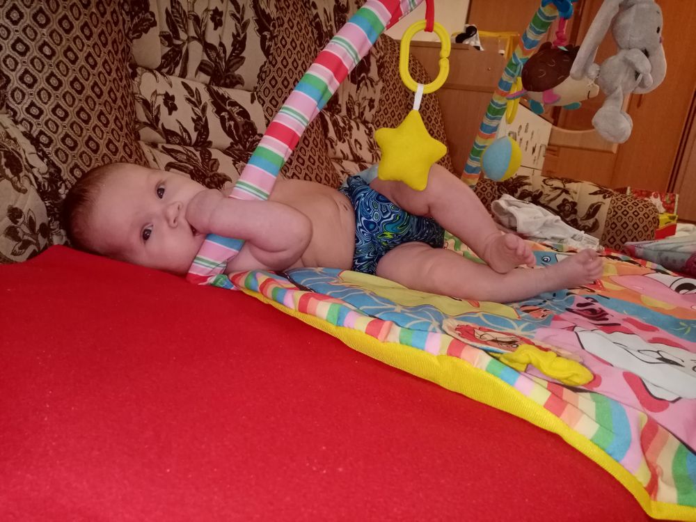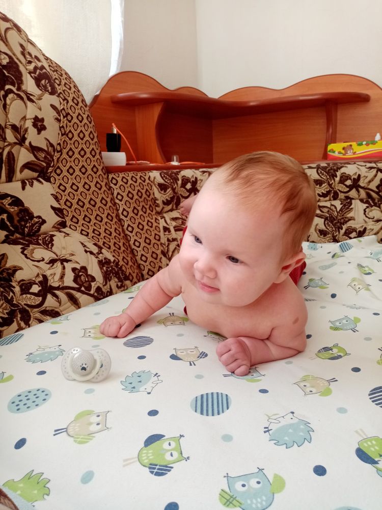 Малышка самая улыбчивая из всех троих. Такая забавная. Поворачивается на живот, уже непло держит голову и плечи, начала координировать движения, уже ловит висящую рядом игрушку или стучит по ней руками-ногами и смеётся😊 Из всех троих первая взяла соску сразу и неплохо с ней засыпает, когда ничего не беспокоит и сытая. И вообще может подолгу сама лежать на коврике развивающем или в люльке. В общем золотой ребёнок😅