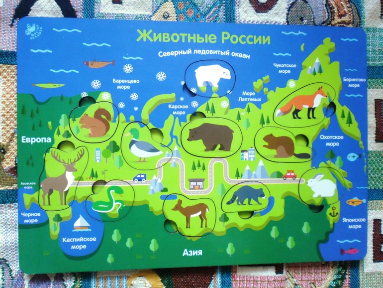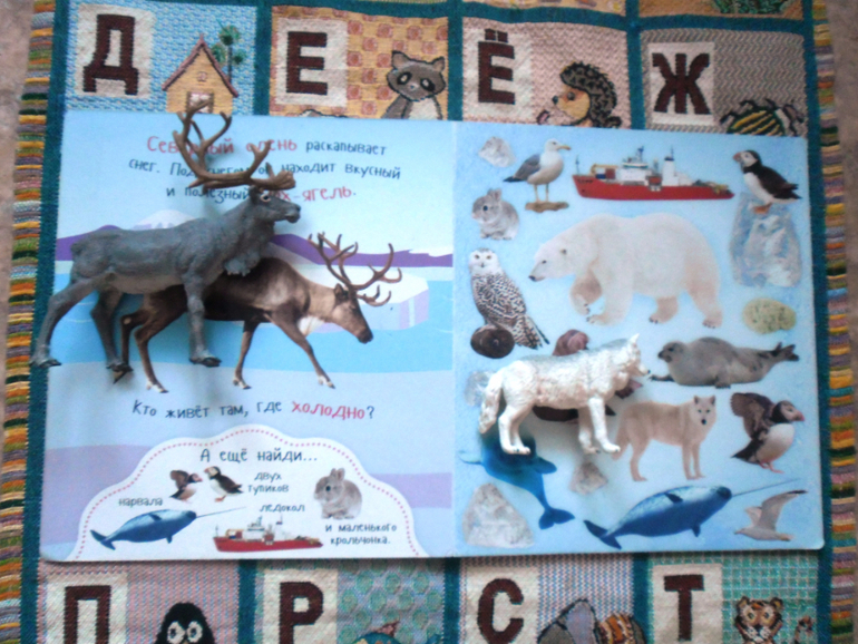 Как дополнение к книге про животных и нашей коллекции зверей недавно приехала рамка-вкладыш про Животных России. Теперь ещё и картинки из этой рамки распределяем по рисункам в книге:)