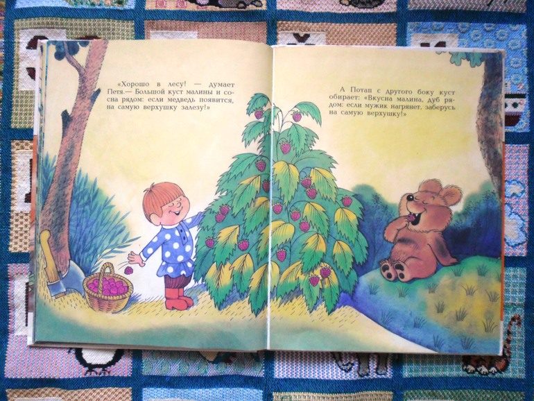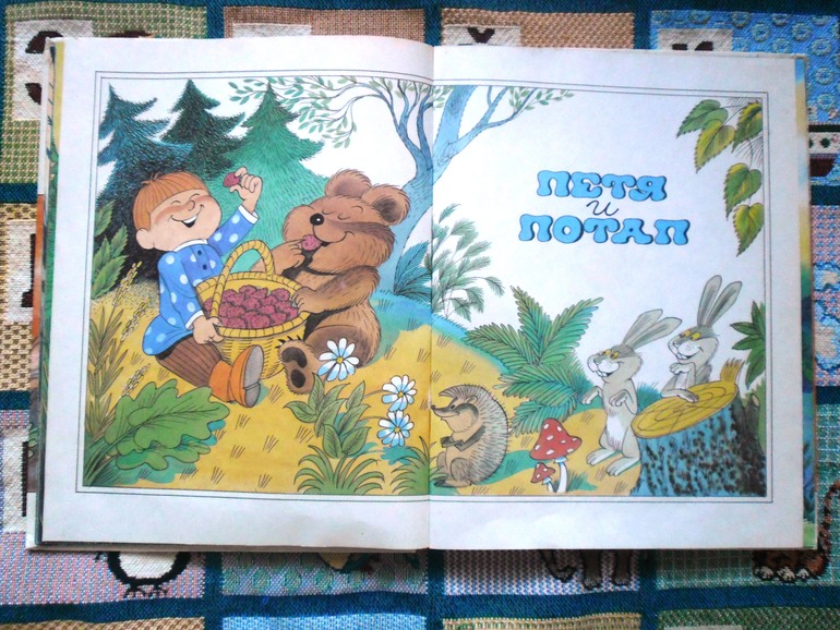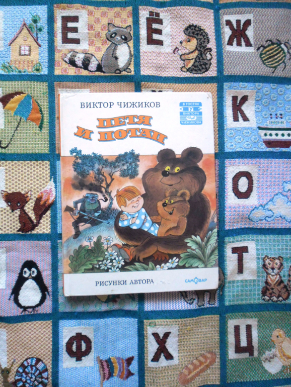 1.Самой первой книгой, которую сын начал слушать и стал даже сам приносить для прочтения ,стала книга "Петя и Потап" Виктора Чижикова. Книга появилась у нас как раз около 1,8 - мама достала её из домашней библиотеки (это была книга моего младшего брата). Сыну очень полюбилась именно история про мальчика Петю и Медвежонка Потапа. Её мы в основном и читаем, изредка читаю и остальные:)