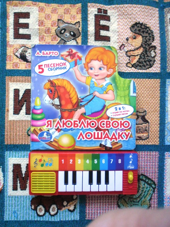 3. На третьем месте у нас музыкальная книга со стихами Агнии Барто. Она пользуется любовью у сына с момента покупки с попеременным успехом. Уже посадил батарейку, т.к. в последнее время как раз активно включал самые любимые песни, показывая на нужные страницы, и танцевал:)