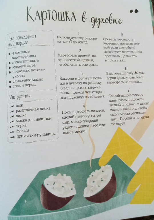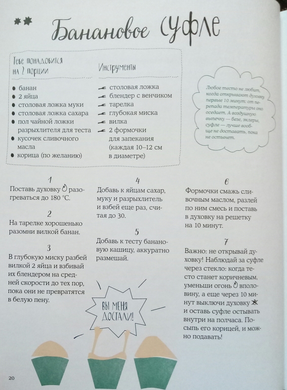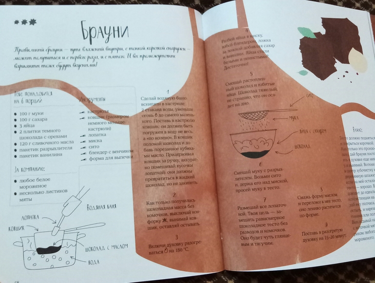 Честно, название очень понравилось) Вообще эта книга с рецептами для детей, которые уже сами решили освоить искусство кулинарии. И поэтому в книге рецепты несложные, очень понятно пошагово расписанные, с доступными ингредиентами. Так что я, можно сказать, убила двух зайцев, это как раз то, что нужно нам с сыном для совместного непринужденного творчества на кухне, ну и надеюсь, дочке пригодится) Я сначала удивилась, и даже немного расстроилась, что нет красивого фото готовых блюд, но потом рассудила так, кулинарные шедевры не всегда получаются с первого раза, и вдруг у ребенка получится намного хуже, чем на картинке?вдруг расстроится, будет переживать? так и охоту готовить можно отбить, а так как не сделает, все хорошо) а в дальнейшем, когда во вкус войдет, можно будет и переходить на более сложные книги и рецепты)