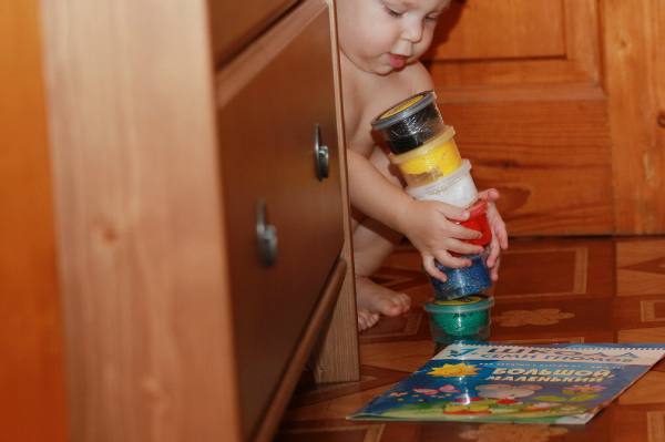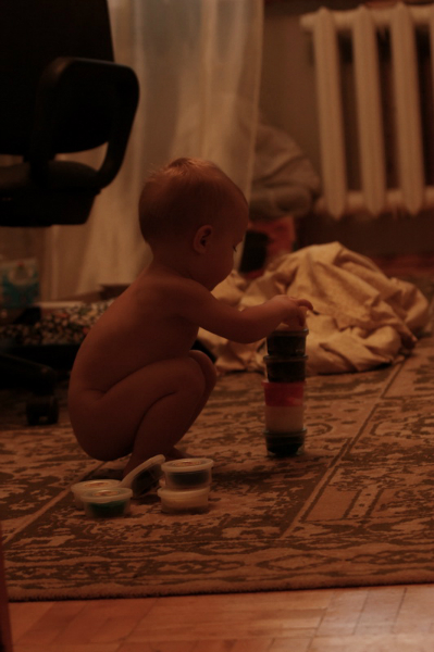 Банки с пластилином. У нас, кстати, совсем не жарко. Просто меня распирает схватиться за камеру в разгар сборов на прогулку. Дни разные, а ребенок везде голый...
