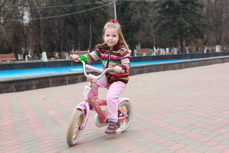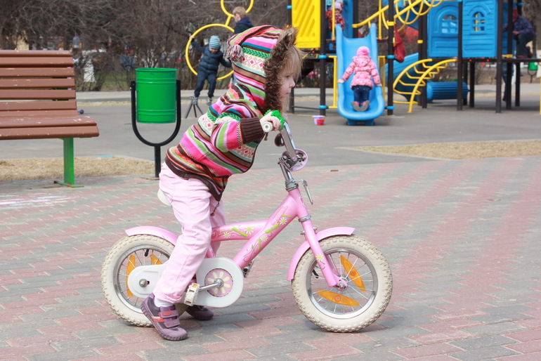 Как только на велик уселись, стало ясно, что с выбором не прогадали. Ногами до педалей доставали в самый раз, а вот до земли уже не доставали совсем :)) Точнее Настя могла дотянуться до земли мыском всего одной ноги, при этом велосипед, соответственно, кренился в сторону опорной ноги. Что в этом плохого? То, что толкаться ребенок не научится сам, пока не дорастет. Ездить на нем Настя научилась в первые же 10 минут и останавливаться тоже. А вот "запускать" её мне приходилось весь сезон самой.