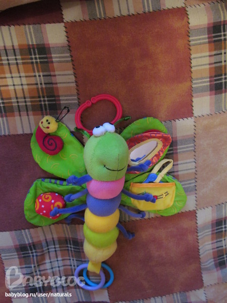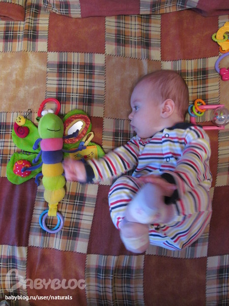 наша первая развивающая игрушка! восторг был..) она прям теребит ее так смешно! и из за того что она большая не выпадает никуда))) ато заметила что погремушки нас уже не интересуют))