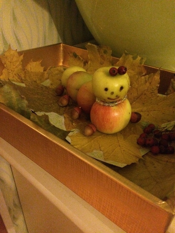 Детский сад активно готовится к осеннему утреннику. Ну и, как полагается, каждый год поделки из овощей и фруктов. Каждый год что-то придумывали сюжетное, типа избушка, колодец, человечки... а в этом лень матушка, решили скромненько - гусеничку. Вот, сделали, завтра понесем.
