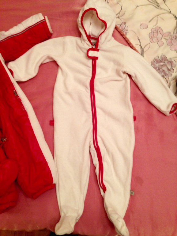 Цена 2500 руб.+ доставка (я регион) В хорошем состоянии, но есть небольшие потертости на светоотражающих полосках и маленькая дырочка на рукаве. Можно заклеить, она особо не видна, обнаружила только сейчас, когда фотографировала. В комплекте идут пинетки, которые пристегиваются, варежки и флисовая поддева. Мы носили осенью без поддевы и зимой в коляске с меховым конвертом до -10.