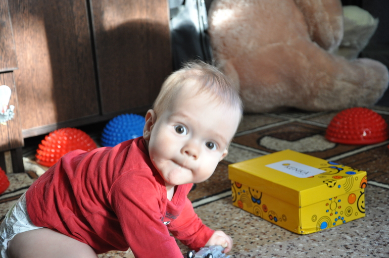 - Миша теперь обожает играть в мячик, причём абсолютно осознанно: бросает с высоты поднятой руки, мяч катится к маме, и мама должна также отправить его к Мише - тогда он радостно хихикает. В восторге от игры "бросаем всё из кроватки, а мама поднимает" - нравится всем, даже маме :):):)
