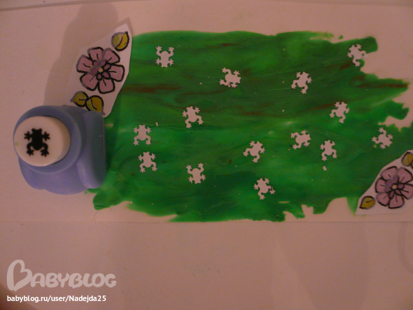 творчествоВчера утром мы с Сашей забавлялись аппликациями. Лягушачий пруд. Пруд из пластилина,лягушек наклепали степлером. Причем лни из среплера натурально выпрыгивали. Это было самое веселое во всем процессе: