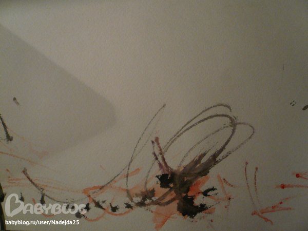 Вечером Саша взяла краски,кисточку,попросила воды и села рисовать. Сама. Она стала комментировать свои рисунки,рисует и рассказывает: "Это птичкины следы (справа внизу,ихбыло больше,потом из птичкиных следов сделала слонов), это большой красный слон,это черный (нарисовала спиральку)это птичка, и опять черные птичкины следы." На том и остановилась,на картинке птичка и ее следы.
