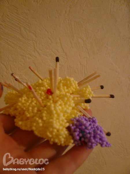 Утащила коробок спичек. Захожу в комнату,а таааам... Саша колдует,воткнула,все ,что в коробке было. Это Ежик из Смешариков,естественно: