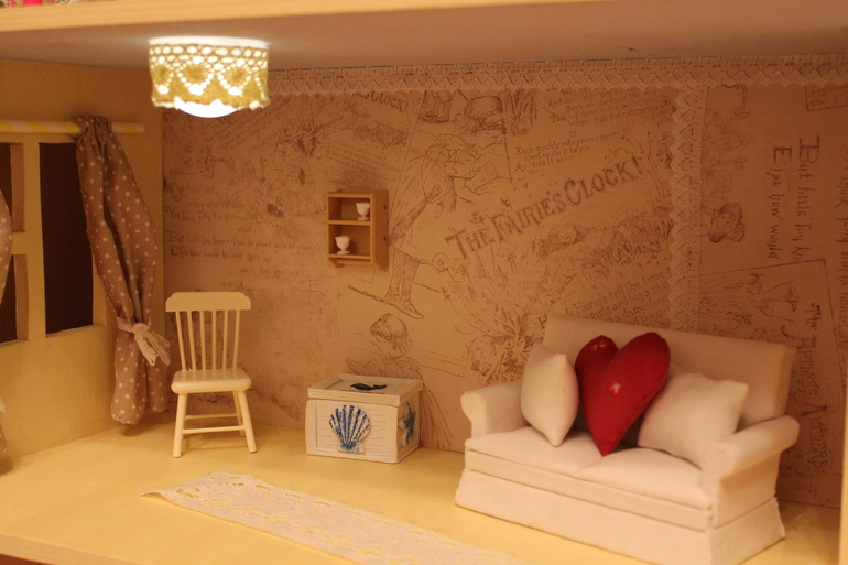 Внутри стены и пол покрашены желтой краской, покрыты лаком. На некоторые стены наклеены обои (бумага для скрапбукинга) и декорированы кружевом и лентой. Внешняя сторона дома покрыта грунтовкой чтобы была фактурность, покрашена светло сиреневой краской и покрыта лаком. Крыша сделана с помощью фактурной пасты для создания объемных элементов и специального валика.