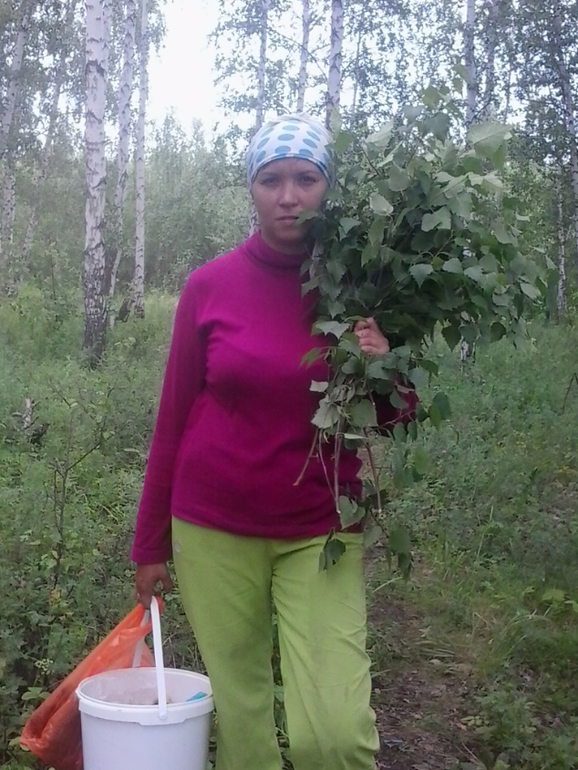 На обратном пути нарвала березовых веток для веника в баню )))).Будем париться вечерком. В пакете душица, в ведре грибы. Уставшая, но счастливая!
