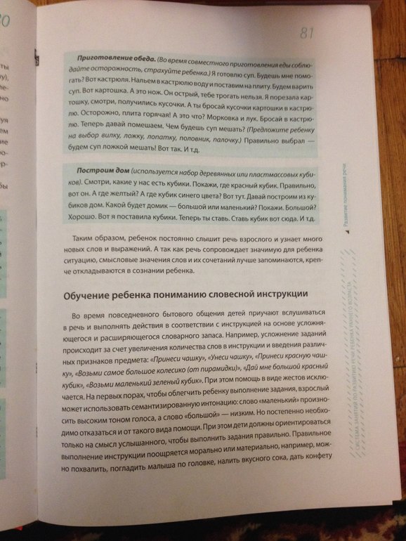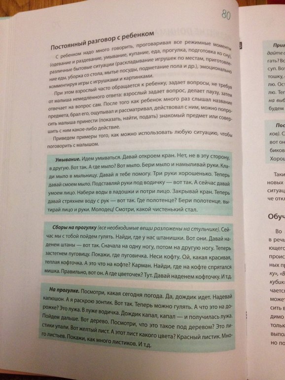 Привет. Хочу выложить две странички из книги логопеда Елены Янушко «Помогите вашему малышу заговорить». Очень часто мамы спорят о том, как нужно говорить с ребенком, чтобы его пассивный словарь пополнялся и улучшалось понимание речи. На этих страничках даны очень конкретные примеры обращенной к малышу речи в простых повседневных ситуациях, может быть кому-то эти примеры помогут выстроить повседневное общение с малышом.