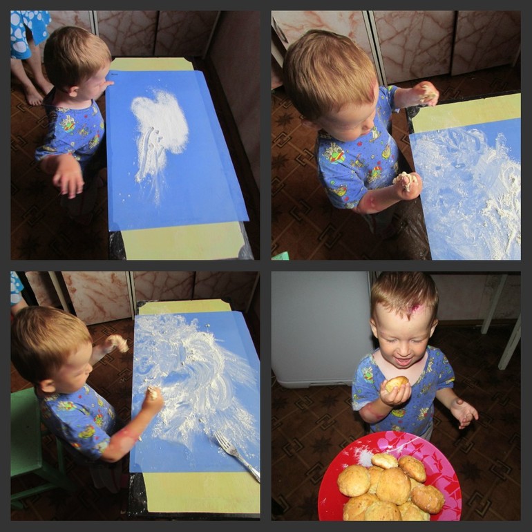 Лепил, лепил, а потом пошли разводить огонь. Плита у нас газовая, поэтому Кирюша усердно дул на спичку. Получились очень вкусные колобки!!!! Но один убежал и мы его везде искали (называла предмет а Кирил к нему бежал).