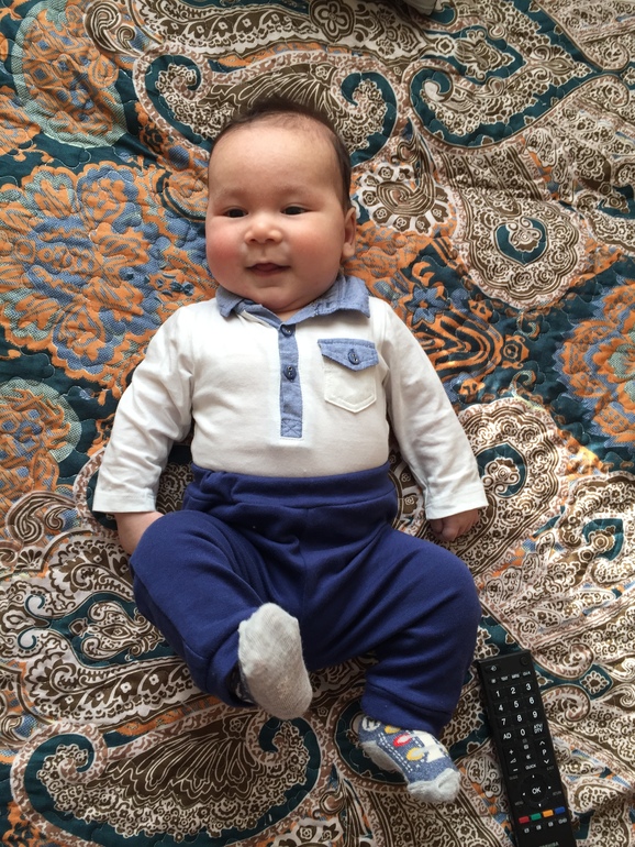 Какой он уже большой )) дней 10-12 назад с трудом, с пыхтением перевернулся со спины на живот. Сейчас уже во всю переворачивается. Одного не оставишь )). Обратно пока не получается. Тянется к игрушкам. Хочет ухватиться за мобиль и за погремушку и сразу в рот )) В голос пока ещё не смеётся, а мы так ждём ☺️ Весит 6,6 кг, рост 62см ))
