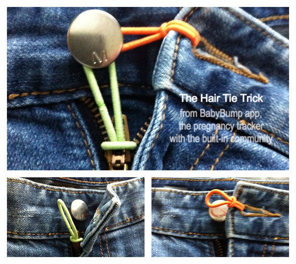 Когда любимые джинсы на пузе уже не застегиваются (или застегиваются, но доставляют дискомфорт), а беременные штаны с широкой резинкой вы по какой-либо причине носить пока не хотите - 2 резинки для волос и вау-ля..: