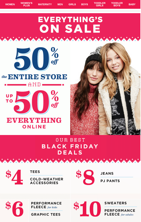 У дочки Гэпа http://oldnavy.gap.com тоже сумасшедшие скидки. Если будете брать в Олдневи, прихватите что-нибудь из Гэпа.