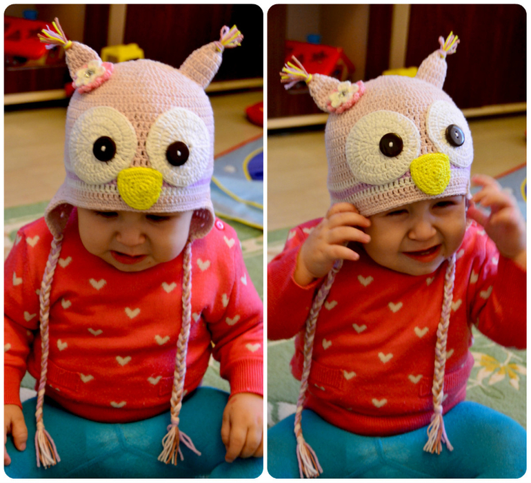 Мама шапку нацепила)))Соня явно не в восторге) Шапки — класс!!!!Хочу такую синенькую...давай в лс. Ты мне расскажешь что там надо померить, и я расскажу какие цвета мне нужны на шапке) Сове шапку Совы)))