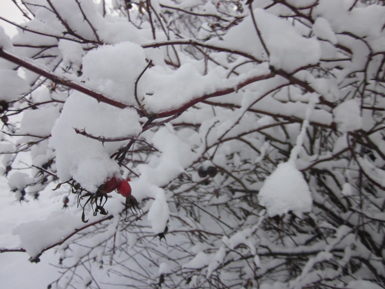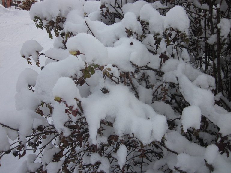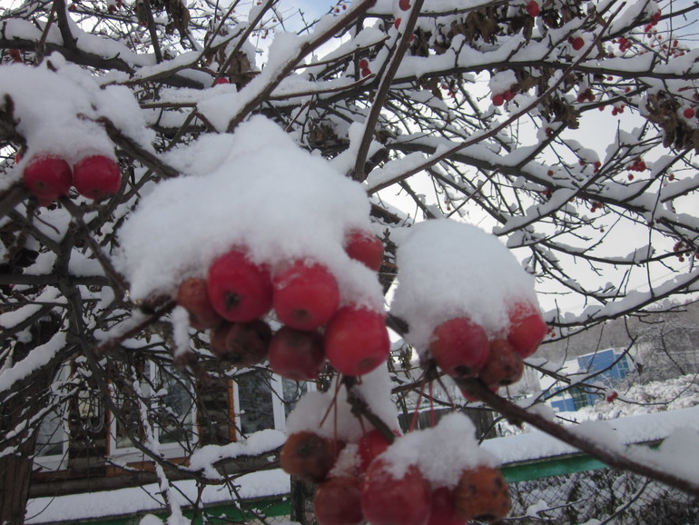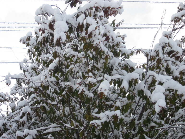 Деревья в этом году не успели сбросит свой осенний наряд. Их еще с листьями укрыло пушистым снегом