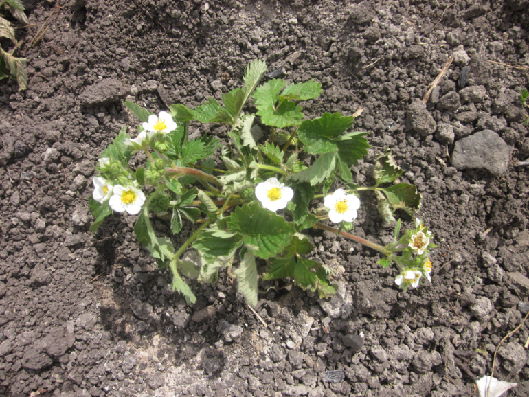 Земляника в этом году вымерзла вся. Осталась только усатая, она цветет: