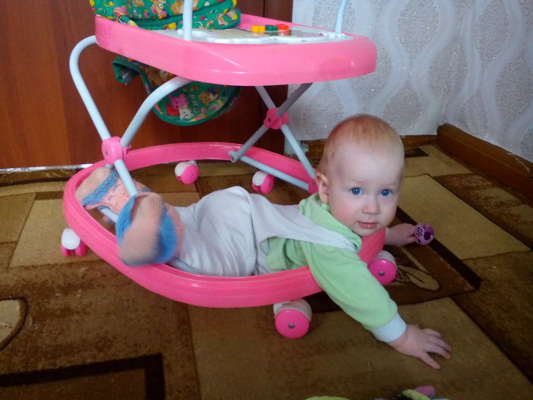 Отлично ползает, ходит у опоры. Может легко стоять без поддержки. Но стал такой хитрый.... За ручки перестал ходить вообще. Плюхается на попу и все, лучше на коленях добежит... Ходить сам не пытается.